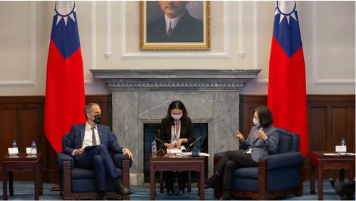 Tổng thống Đài Loan Thái Anh Văn tiếp trưởng phái đoàn nghị sĩ Châu Âu Raphaël Glucksmann tại Đài Bắc, ngày 04/11/2021 via Reuters – Taiwan Presidential Office