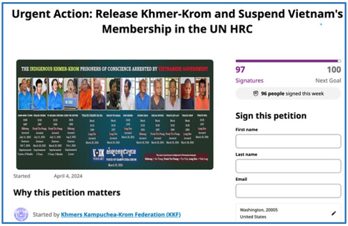 Thư ngỏ được đăng tải trên trang change.org vào ngày 4/4 để thu thập chữ ký, trong đó khẳng định "cuộc đàn áp gần đây của Việt Nam đối với cộng đồng người Khmer Krom bản địa đã đạt đến mức báo động, với nhiều báo cáo về các vụ bắt giữ tùy tiện, bỏ tù bất công và đàn áp tôn giáo".