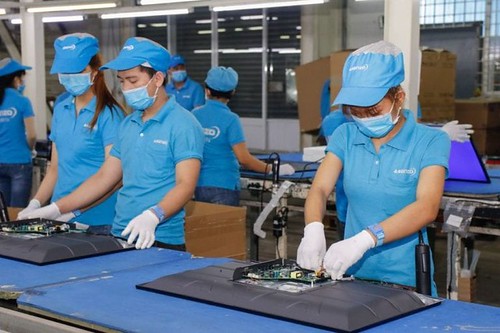 Công nhân của "nhà sản xuất" Asanzo lắp ráp các bộ phận của chiếc tivi nhập cảng từ Trung Quốc rồi dán hàng chữ "Made in Vietnam". Công ty này bị tố cáo đánh lừa người tiêu thụ là "hàng Việt Nam chất lượng cao". (Hình : Kinh Tế Tiêu Dùng)