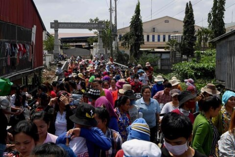 Công nhân Campuchia rời khỏi nhà máy của họ khi họ nghỉ trưa ở Phnom Penh, ngày 2 tháng 3 năm 2020. Ngành may mặc trị giá hàng tỷ đô la của Campuchia có nguy cơ bị gián đoạn chuỗi từ đột phá Covid-19, vì nó tác động đến các ngành công nghiệp chủ chốt của Đông Nam Á . (Tang Chhin Sothy / AFP)