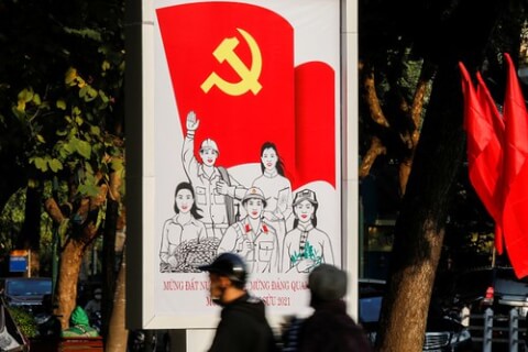 Tấm biển cổ động cho Đại hội 13 Đảng Cộng sản Việt Nam ở Hà Nội hôm 25/1/2021 - Reuters