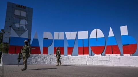 Các binh sĩ Nga đi bộ gần biển chào mừng "Mariupol", được sơn màu quốc kỳ Nga ở lối vào Mariupol ngày 12/06/2022. AFP - YURI KADOBNOV