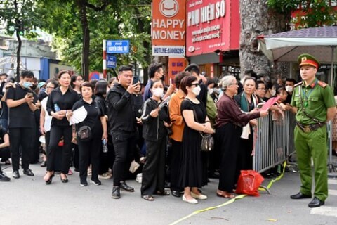 Người dân Việt Nam xếp hàng bên ngoài nhà tang lễ quốc gia để viếng cố Tổng bí thư Nguyễn Phú Trọng hôm 25/7/2024 - Nhac Nguyen / AFP