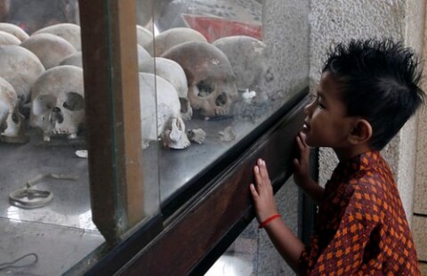 Một em nhỏ đang nhìn những hộp sọ tại nơi tưởng niệm những nạn nhân thời Khmer Đỏ ở ngoại ô Phnom Penh, Campuchia hôm 17/4/2014. AP