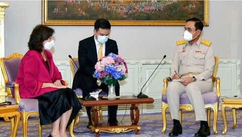 Đặc phái viên Liên Hiệp Quốc về Miến Điện, Noeleen Heyzer (trái) gặp thủ tướng Thái Lan, Prayuth Chan-ocha (phải) tại Bangkok, ngày 17/01/2022 để bàn giải quyết khủng hoảng ở Miến Điện, AP