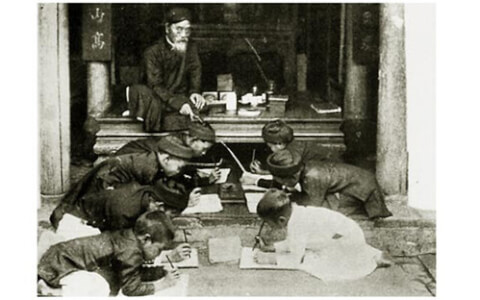 Lớp học chữ Nho ngày xưa, thầy đồ cầm roi ngồi trên, học trò ngồi dưới viết chữ. Ảnh tư liệu