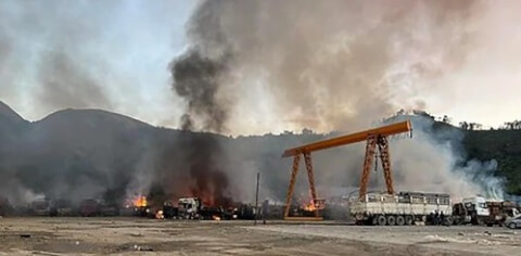 120 xe hàng của Trung Quốc tập trung ở kho bãi đã bị thiêu rụi và người ta nghi là do phiến quân làm.
