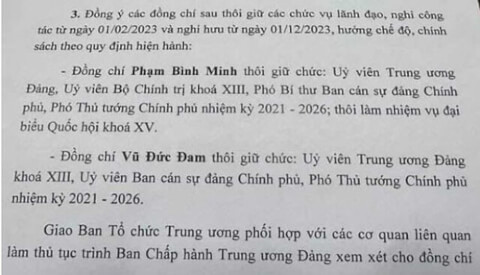 - Đồng chí Vũ Đức Đam thôi giữ chức vụ Ủy viên Trung ương Đảng khóa XIII".