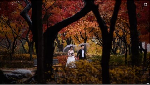 Tân lang quân và tân giai nhân trong một công viên ở Seou, Nam Hàn. Hình minh hoạ.