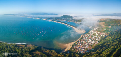 Toàn cảnh hành lang bảo vệ bờ biển Phú Yên, địa phận Khu tái định cư Lễ Thịnh, thôn Phú Lương, xã An Ninh Đông, huyện Tuy An. Ven biển là hàng trăm tàu thuyền neo đậu, chụp lúc hơn 7g sáng. Cá cơm và tôm hùm giống là đặc sản của làng biển này.