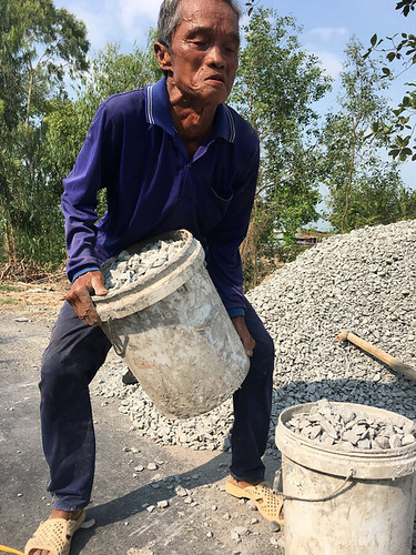 Ông Năm Chà (74 tuổi), người lớn tuổi nhất đội lão nông xây cầu từ thiện - Ảnh : H.TRIỀU