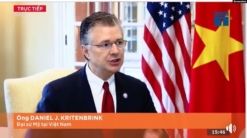 Đại sứ Mỹ tại Hà Nội Daniel Kritenbrink trả lời phỏng vấn VTC1. (Ảnh chụp màn hình VTC1 qua Facebook của Đại sứ quán Mỹ ở Việt Nam)