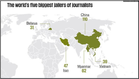 Đứng số 1 trong danh sách nêu trên là Trung Quốc, cũng là một nước cộng sản, với 110 nhà báo bị cầm tù ; tiếp theo là Myanmar, 62 nhà báo ; và thứ ba là Iran, 47 nhà báo. Đứng thứ năm, dưới Việt Nam, là Belarus, nơi có 31 nhà báo bị bỏ tù. RSF nói rằng 5 nước nêu trên chiếm 54% số các nhà báo bị chính quyền giam cầm.