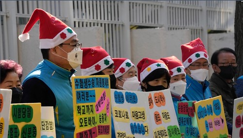 Phụ Huynh đeo khẩu trang cầu nguyện an toàn và may mắn cho con em vào đêm trước ngày thi vào đại học trước tòa nhà chính phủ ở Seoul, Nam Hàn, 17 tháng 11. Khoảng hơn nửa triệu học sinh trung học toàn quốc sẽ lấy bài test CSAT. (AP Photo/Ahn Young-joon)