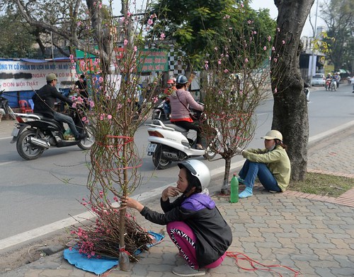 Nông dân bán hoa đào dọc một con đường dẫn vào trung tâm Thành phố Hà Nội - AFP