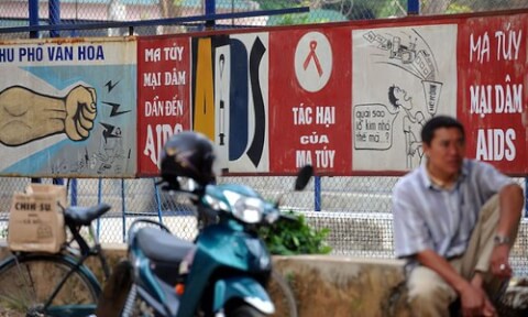 Một người đàn ông ngồi trước các tấm biển phòng chống nạn mại dâm và ma tuý ở Sơn La hôm 5/5/2009-AFP - Ảnh minh họa