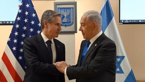 Thủ tướng Benjamin Netanyahu (phải) và Ngoại trưởng Mỹ, Antony Blinken, trong cuộc họp báo tại Israel.