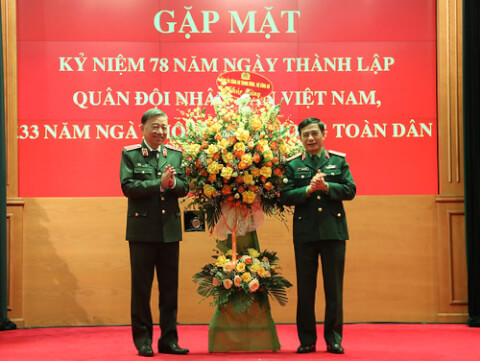 Đại tướng Tô Lâm tặng lẵng hoa chúc mừng Đại tướng Phan Văn Giang và lực lượng Quân đội nhân dân.