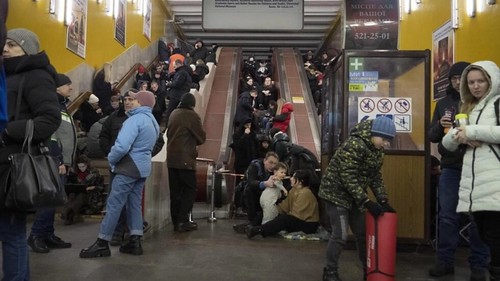 Người dân trú ẩn tại một trạm tàu điện ngầm ở Kiev, khi Nga bắn tên lửa vào thủ đô Ukraine, ngày 10/02/2023. AP - Efrem Lukatsky