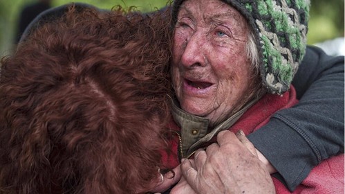 Bà Tetiana, 82 tuổi, cùng con gái sơ tán khỏi thành phố Vovchansk, Ukraine, ngày 11/05/2024. AP - Evgeniy Maloletka