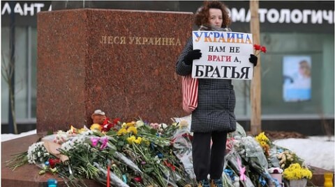Một người phụ nữ cầm tấm bảng "Ukraine không phải là kẻ thù, mà là anh em của chúng ta", Moskva, cuối tháng 01/2023 © Reuters - Stringer