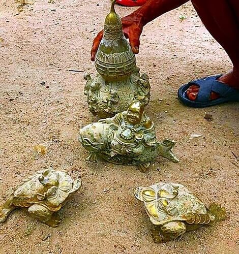 Số tượng phát hiện gồm một bình hồ lô, một tượng Phật Di Lặc cưỡi cá chép, hai con cóc ngậm tiền… đều lấm lem bùn đất nhưng khi chùi rửa đều sáng choang. Khi lắc phía trong rỗng ruột và nghe như âm thanh va chạm giữa kim loại mà người phát hiện cho là vàng.