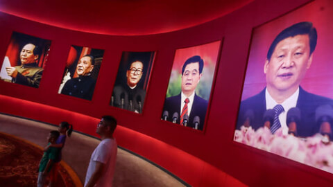 Chân dung Mao Trạch Đông, trái, Đặng Tiểu Bình, Giang Trạch Dân, Hồ Cẩm Đào và Tập Cận Bình được treo tại triển lãm kỷ niệm 70 năm ngày thành lập nước Cộng hòa Nhân dân Trung Hoa tại Trung tâm Triển lãm Bắc Kinh vào ngày 2 tháng 10 năm 2019. (Ảnh chụp bởi Ken Kobayashi)