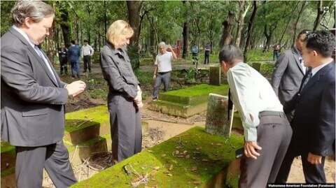 Đại sứ Mỹ tại Hà Nội Marc Knapper (trái) đi thăm Nghĩa trang Quân đội Biên Hòa, hiện nay là Nghĩa trang Bình An, ở Bình Dương hôm 13/10. Hơn một chục nghìn tử sĩ của Việt Nam Cộng hòa được chôn cất tại đây.