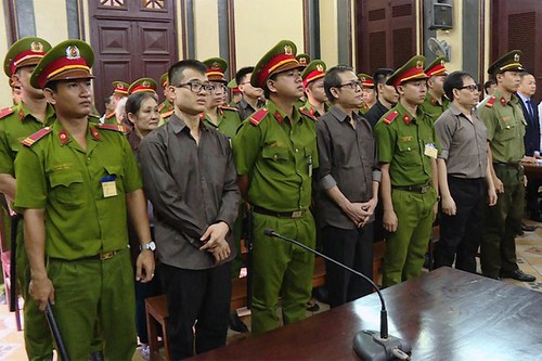 Phiên xử 12 người bị cáo buộc thuộc tổ chức Chính phủ Quốc gia Việt Nam lâm thời. Phiên xử diễn ra tại TPHCM hôm 22/8/2018 - AFP