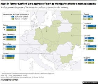 Pew cho biết những câu hỏi về nền dân chủ và nền kinh tế thị trường lần đầu tiên được hỏi vào năm 1991, và sau đó là vào năm 2009. Ở một số quốc gia - Hungary, Lithuania và Ukraine - sự ủng hộ dành cho cả hai điều này suy giảm từ năm 1991 đến 2009 trước khi hồi phục đáng kể trong thập niên qua. Nga là quốc gia duy nhất mà sự ủng hộ dành cho nền dân chủ đa đảng và chủ nghĩa tư bản sụt giảm đáng kể từ năm 2009.