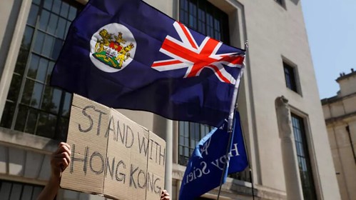 Cờ Hồng Kông được phất lên nhân một cuộc biểu tình ủng hộ dân chủ Hồng Kông trước đại sứ quán Trung Quốc ở Luân Đôn (Anh Quốc) ngày 31/07/2020. Reuters - JOHN SIBLEY