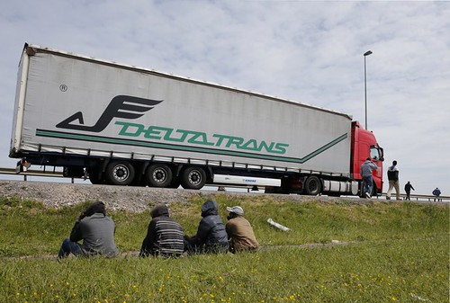 Những người nhập cư ngồi chờ lên một xe tải đi từ Pháp vào Anh năm 2015 - Reuters