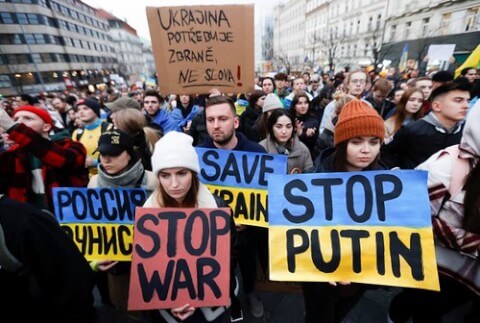 Biểu tình phản đối cuộc chiến xâm lược Ukraine của Tổng thống Nga Putin ở Prague, Czech hôm 24/2/2022