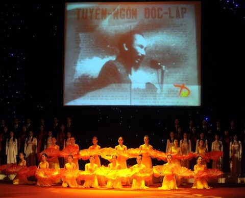 Các nghệ sĩ biểu diễn dưới màn hình chiếu hình Chủ tịch Hồ Chí Minh đọc tuyên ngôn độc lập vào ngày 2/9/1945. Buổi biểu diễn thực hiện ở Hà Nội năm 2009 nhân kỷ niệm 64 năm ngày Quốc khánh Việt Nam và 40 năm ngày mất ông Hồ Chí Minh - AFP