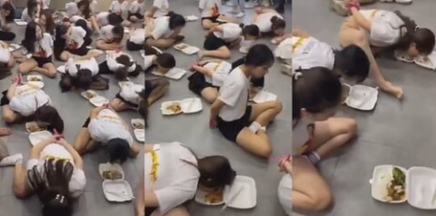 Nhiều nữ nhân viên công ty đa cấp bị trói tay, cúi đầu ăn cơm hộp dưới sàn : Vứt bỏ liêm sỉ ?! (Nguồn : Một Thế Giới, 07/07/2020)