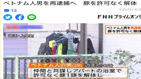 Báo chí Nhật đưa tin về sự kiện lấy phòng tắm làm nơi giết mổ lợn, một người đàn ông Việt Nam tại Saitama bị bắt
