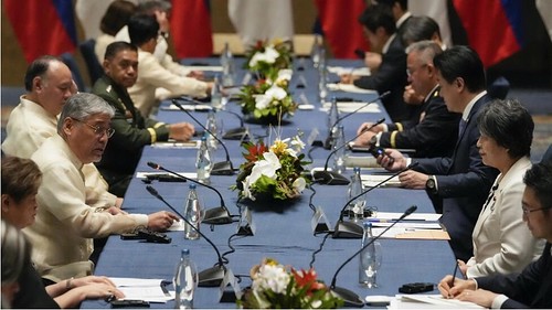 Hội đàm giữa hai phái đoàn Philippines (trái) và Nhật Bản về quan hệ song phương, quốc phòng và an ninh khu vực, tại khách sạn Taguig, Philipines, ngày 08/07/2024. AP – Aaron Favila