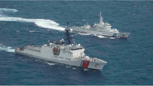 Ảnh do lực lượng tuần duyên Mỹ cung cấp : Tàu tuần duyên của Mỹ và Nhật Bản diễn tập trong vùng Biển Đông ngày 25/08/2021. © U.S. Coast Guard via AP