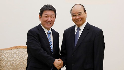 Thủ tướng Việt Nam Nguyễn Xuân Phúc và ngoại trưởng Nhật Bản Toshimitsu Motegi tại Văn phòng Chính phủ ở Hà Nội ngày 06/01/2020. Luong Thai Linh/Pool via Reuters