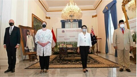 Ngoại trưởng Úc Marise Payne (thứ hai, bên trái), bộ trưởng Quốc phòng Úc Peter Dutton trong cuộc họp với các đồng nhiệm Indonesia, ngoại trưởng Retno Marsudi (thứ hai, bên phải), và bộ trưởng Quốc phòng Prabowo Subianto, tại Jakarta ngày 09/09/2021. AP - Ministry of Foreign Affairs