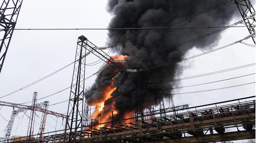 Ngọn lửa và khói bốc lên từ đám cháy tại một cơ sở điện sau cuộc tấn công của Nga ở Kharkiv, Ukraine, ngày 22/03/2024/AP - Yakiv Liashenko