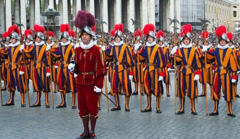 Ai đến thăm Tòa thánh Vatican đều không thể không tìm đến ngắm nhìn đội vệ binh Thụy Sĩ cao lớn oai nghiêm mặc quân phục cổ xưa ba màu vàng lam đỏ, tay cầm giáo dài, chuyên canh gác cổng ra vào của quốc gia nhỏ nhất thế giới này.