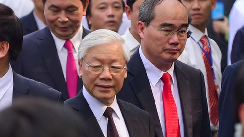 Ông Nguyễn Phú Trọng và ông Nguyễn Thiện Nhân tại Thành phố Hồ Chí Minh hôm 31/1/2018. AFP