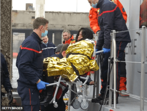 Một phụ nữ Việt Nam mang thai được cáng đi khi chiếc thuyền chở bà cùng 60 người khác đang tìm cách vượt eo biển Manche từ thành phố cảng Calais của Pháp để đến Anh vào ngày 1/4/2021