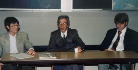 Thi sĩ Nguyễn Chí Thiện (ngồi giữa) cùng với Steve Denny (bên phải) của Indochina Archive, UC Berkeley và Bùi Văn Phú (bên trái) phụ trách thông dịch, trong buổi nói chuyện tại Đại học Berkeley năm 1995 khi ông vừa đến Hoa Kỳ (Ảnh : Bùi Văn Phú)