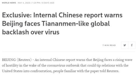 Nguồn tin độc quyền của Reuters cho hay một tài liệu nội bộ của Trung Quốc cảnh báo rằng khủng hoảng Covid-19 sẽ khiến nước này phải đối mặt với làn sóng chống Trung toàn cầu giống thời Thiên An Môn.
