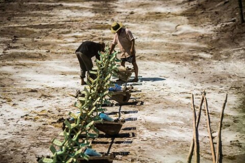 Trong một đợt khô hạn đầu năm 2016, người nuôi tôm Việt Nam chờ nước chảy-Ảnh : Christian Berg / Getty Images.