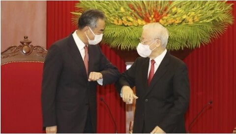 Ngoại trưởng Trung Quốc Vương Nghị và tổng bí thư Đảng cộng sản Việt Nam Nguyễn Phú Trọng trong cuộc gặp tại Hà Nội, Việt Nam, ngày 11/09/2021. AP - Le Tri Dung