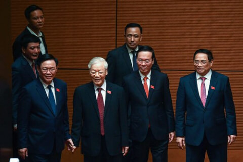 Các lãnh đạo cấp cao của Đảng cộng sản Việt Nam (từ trái qua) : Chủ tịch Quốc hội Vương Đình Huệ, Tổng bí thư Nguyễn Phú Trọng, Chủ tịch Võ Văn Thưởng, Thủ tướng Phạm Minh Chính tại Quốc hội ở Hà Nội hôm 22/5/2023 - AFP