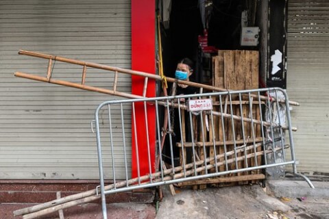 Người dân đứng sau rào chắn chống dịch ở một ngõ tại Hà Nội hôm 30/8/2021 / AFP - Ảnh minh họa